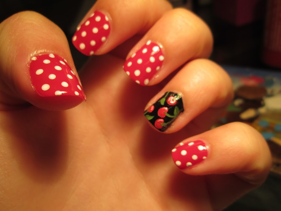 En las uñas rojo, el diseño es muy sencillo, una simple trama de lunares blancos.