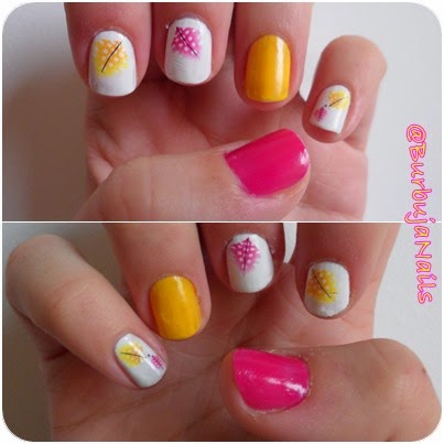 2. Pintamos la uña anular de rosa, la del corazón de amarillo y el resto de blanco.
