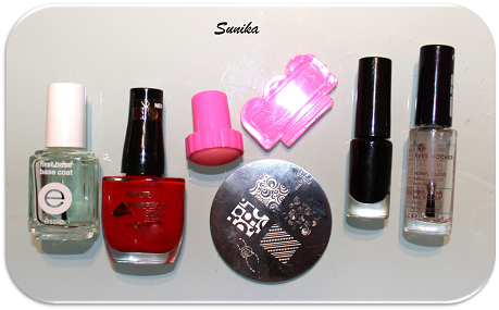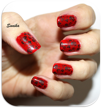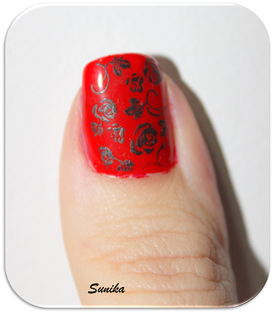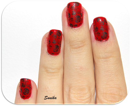 Cómo podéis ver he estampado unas pequeñas rosas de la placa M65 de Konad en color negro con un esmalte que pertenece al kit de estampación que me regalaron estos Reyes, como base he usado un esmalte rojo de Astor. Para proteger las uñas usé como siempre mi base de essie que me encanta y para terminar un brillo de Yves Rocher para proteger la manicura.