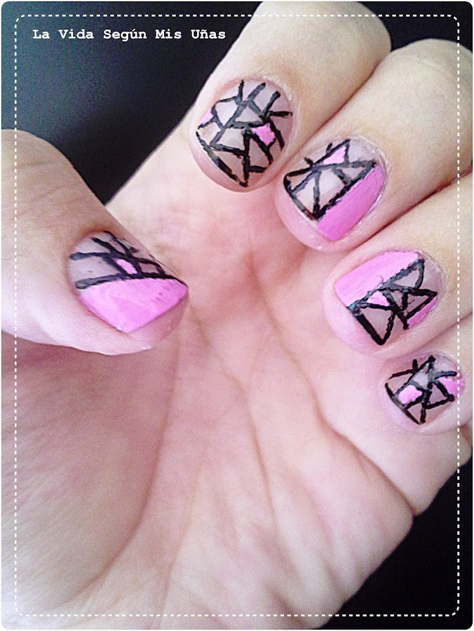Además, para rellenar algunos huequitos he utilizado un rosa que es entre chicle y pastel , que a mi me parece precioso, a ver que os parece a vosotras. También para darle un toque diferente he optado por no bordear la uña en negro por dentro como hacen la mayoría de las chicas que hacen esta manicura y, además, he pintado en algunas uñas la mitad de la uña en esmalte rosa, que me gustaba más como quedaba.