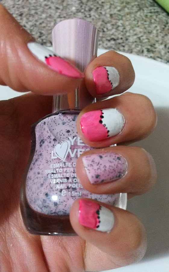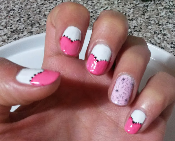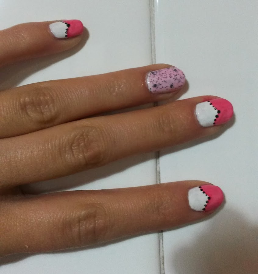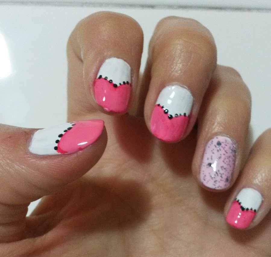 1. Pintar las uñas de blanco, menos el anular que lo pintamos con un pintauñas que tiene topitos negros.