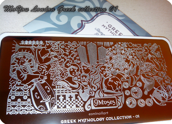 Además hoy os muestro la otra plaquita de mi colaboración con MoYou London, se trata ni más ni menos de la 01 de la Greek Collection, es decir, la de las 9 musas. Es una placa preciosa, con un montón de diseños que me encantan, como son las caras de las 9 musas, una frase y alguna palabra, las moneditas con los búhos... Sin duda tengo que hacer otra manicura para mostraros todo el potencial de esta placa :)