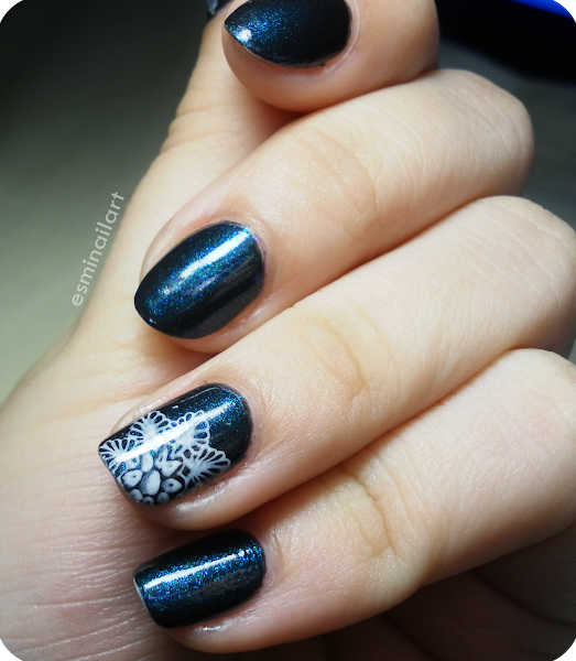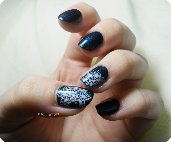 En este caso estampé con el Milk de Rare Nails (un blanco muy cubriente) esta especie de flor tan bonita... Me encanta!!! En los anulares lo estampé solo en un lateral de la punta dejando medio diseño fuera, mientras que en los pulgares lo puse entero. He de decir que cada vez le tengo más cogido el truco a estas placas y, sobre todo, al estampador de MoYou, que me encanta! Cada vez me gusta más y más esta marca, sin duda recomendadísima!