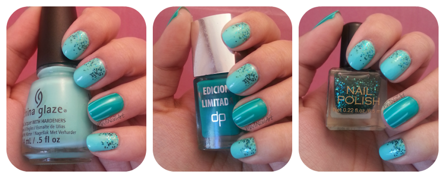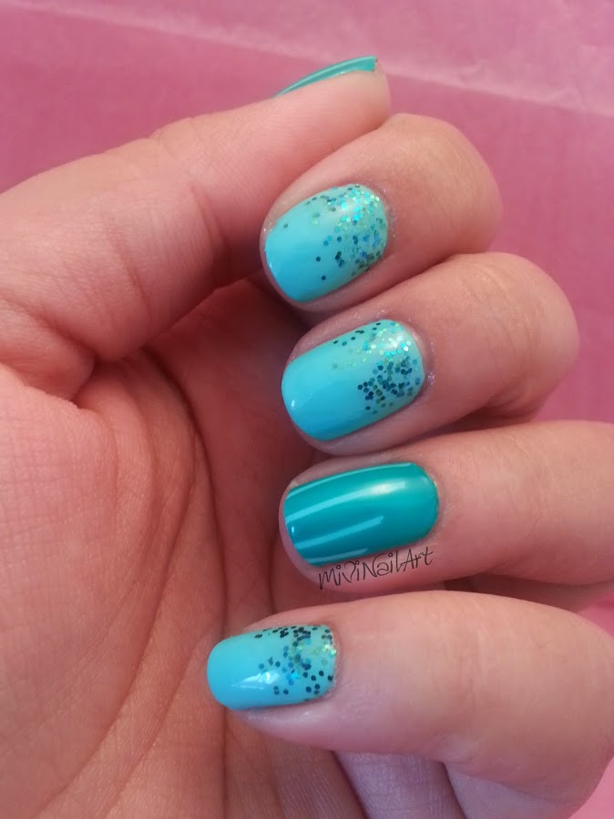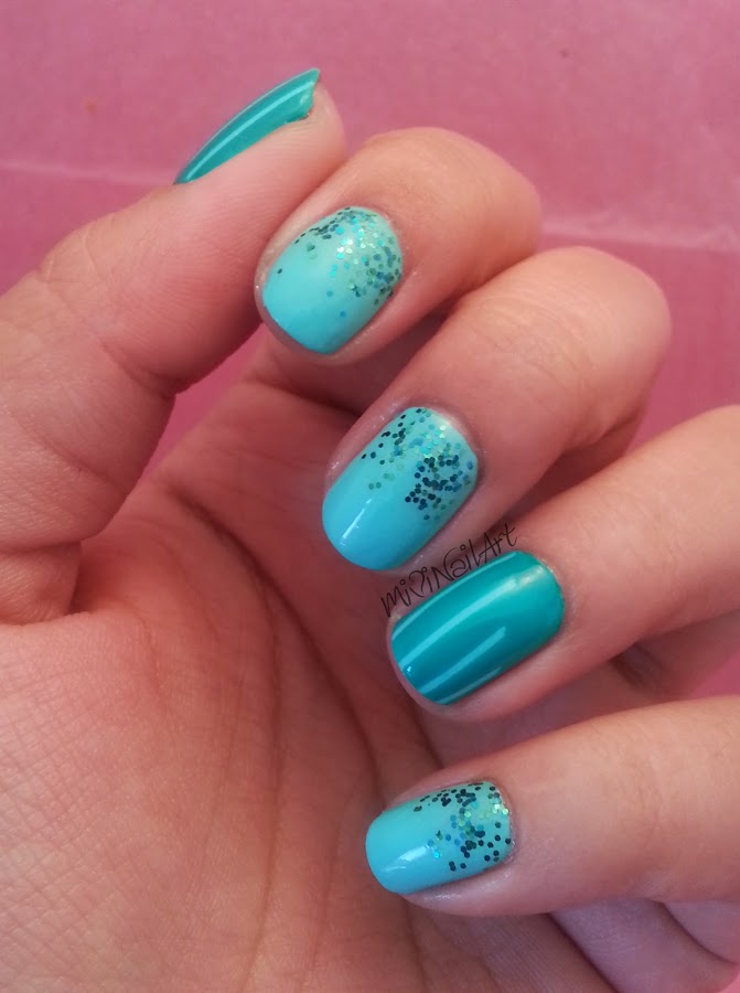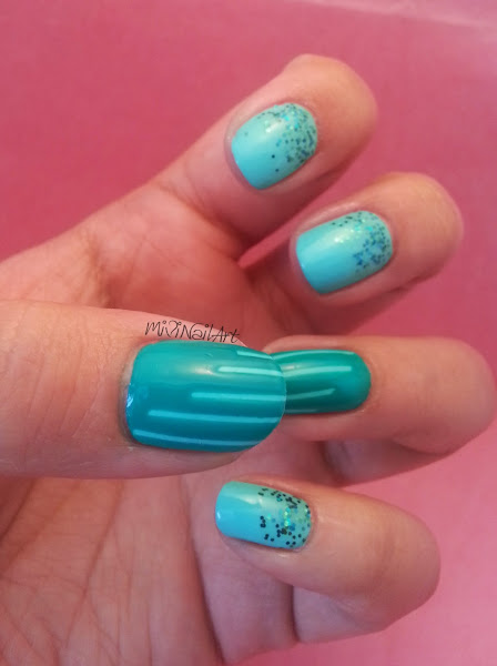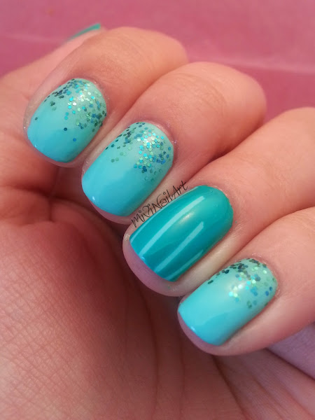 Lo mejor es que tiene glitter azul verdoso y me iba fenomenal para este esmalte jejeje Si es que hacen una pareja divina, ¿a que si? :D