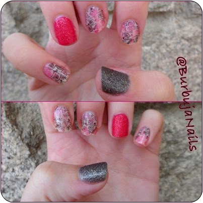 5. Estampamos y damos top coat solo en las uñas con la estampación, si lo diéramos en las otras dos perderíamos el efecto que tiene el esmalte.