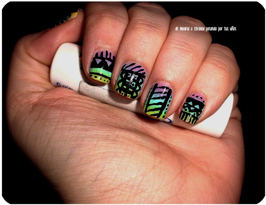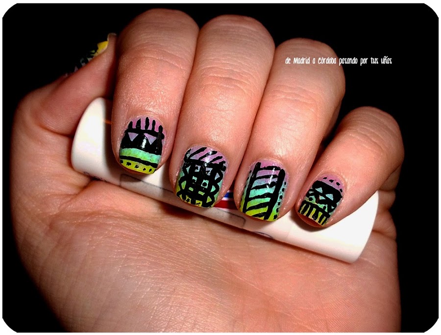 Como veis, la manicura consiste en hacer un degradado con tres colores y hacer los dibujos tribales encima. Los dibujos los hice con acrílicas, supongo que ya sabéis que es mucho más fácil que hacerlo con esmaltes, y te da más posibilidades con los dibujos. Además de que si haces algo mal, con un poco de agua se soluciona.