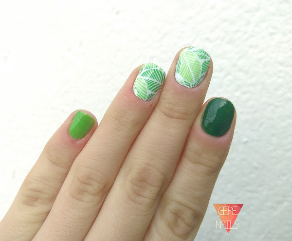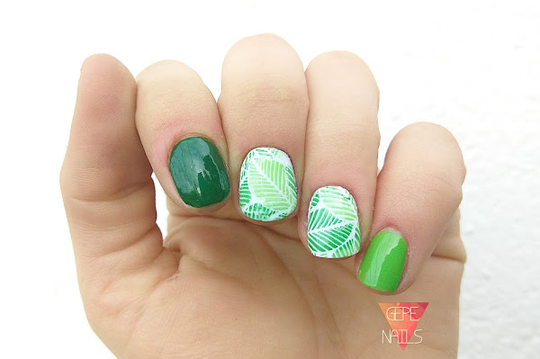 Esta manicura es muy sencilla de hacer ya que solo he hecho las dos estampaciones. Para hacer las hojas de diferente color, con cuidado, rellené los huecos de la placa con dos colores distintos. La verdad que no tuve problemas de que se mezclaran los colores y tal, así que estoy muy contenta.