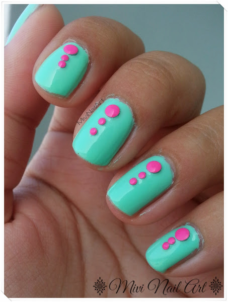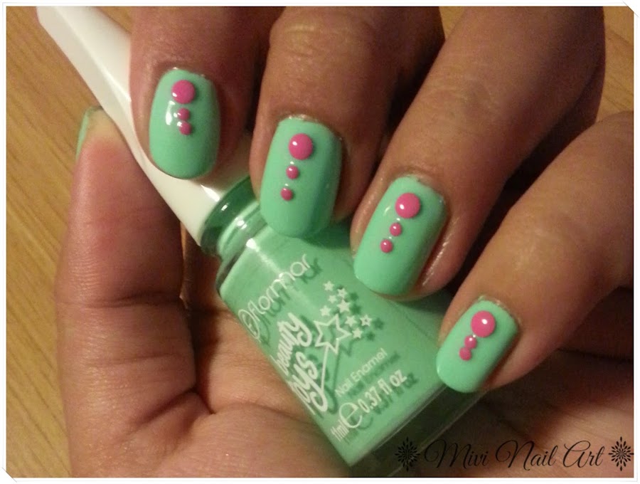 Veis, lo justo y necesario. El top coat poshé, base coat Nail Envy de OPI, esmalte verde BT02 "Beauty Toys" de Flormar y una rueda de tachuelas redondas fluor (que compré en ebay, aquí.)