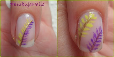 4. Para no dejar las plumas tan sosas pintamos el tronco de la pluma con el dorado para nail art.
