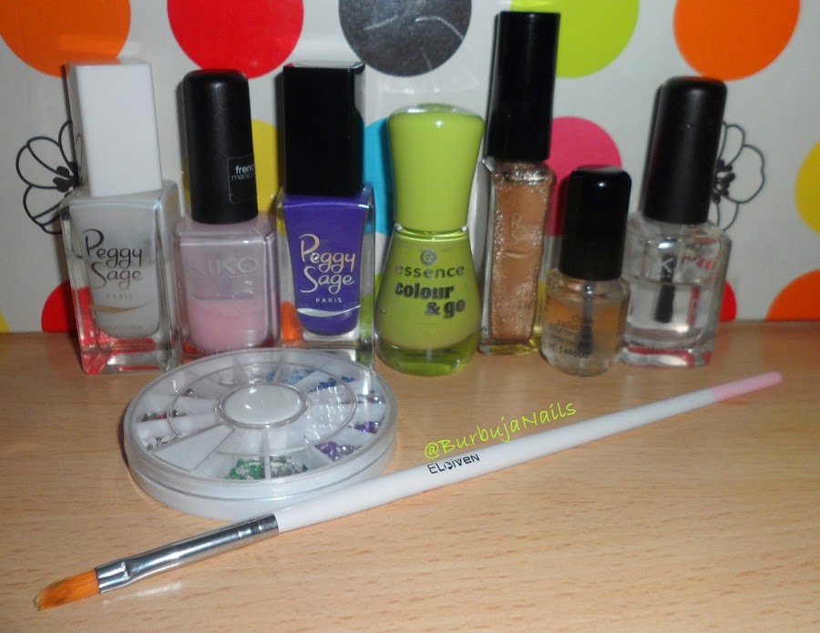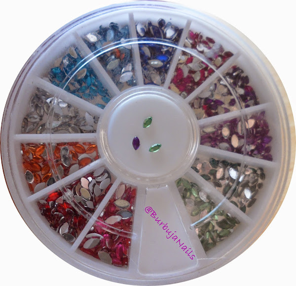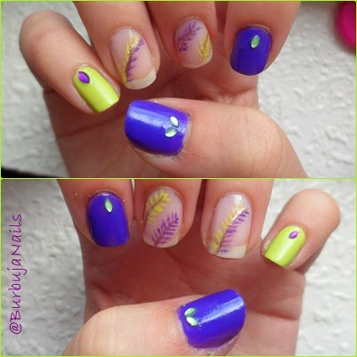 5. En la uña verde ponemos un brillante morado y en las moradas uno verde.