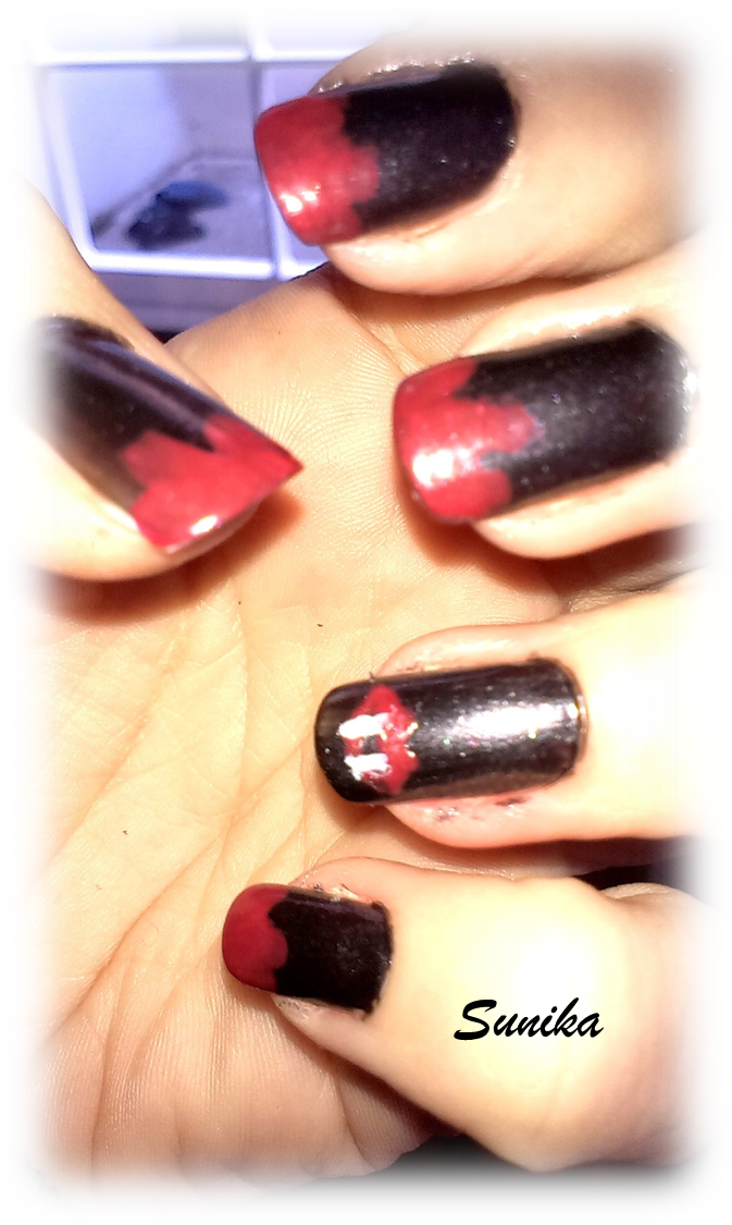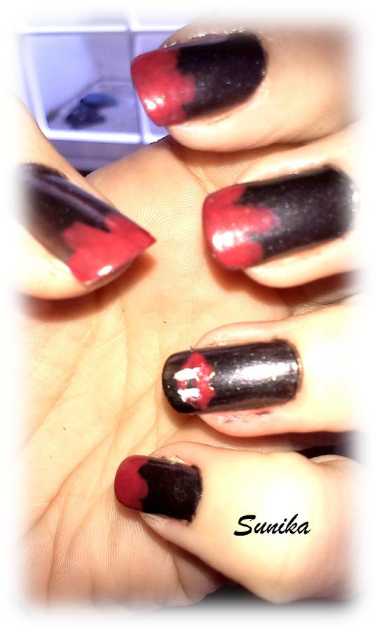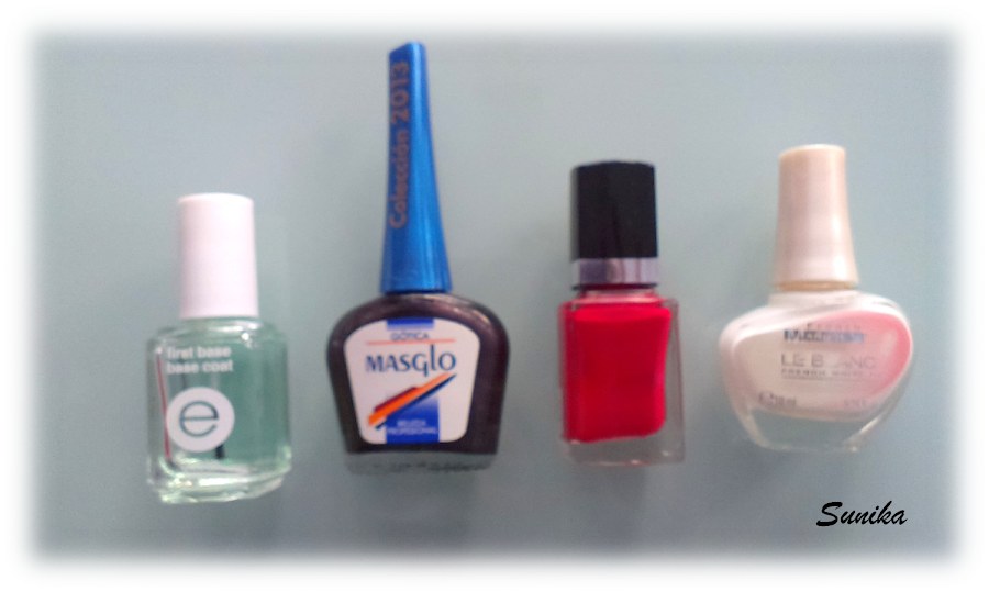 La base de Essie, como esmalte base oscuro el Gótica de Masglo. Para el efecto de la sangre y los labios un esmalte rojo sangre. Y los colmillos con el blanco de Yves Rocher.