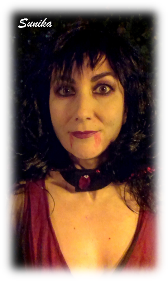 Y para el maquillaje utilicé polvos blancos compactos de MAC, Sombra negrany una roja de Coastal Scents y un gris para dar ese efecto de muerto que compre en El Barullo junto con un labial rojo sangre muy apropiado para el tema ¿no os parece?