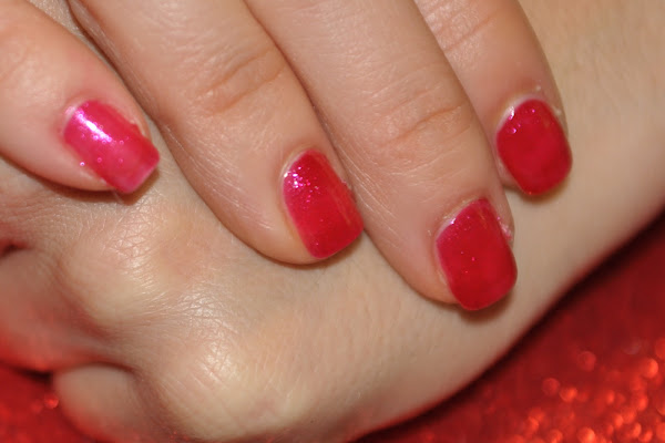 Las siguientes manicuras están hechas con los mismos esmaltes ya que dan mucho juego,usando tanto juntos como separados.Para ello necesitamos un esmalte rojo y otro de purpurina dorada: