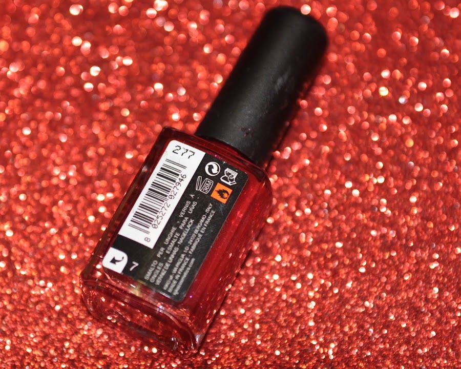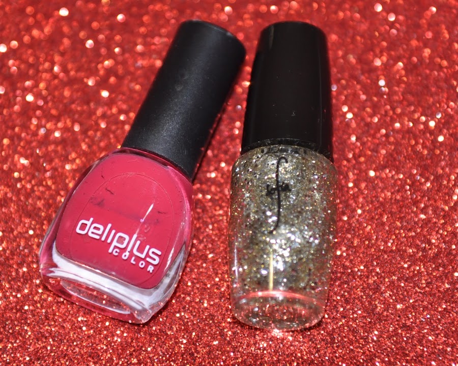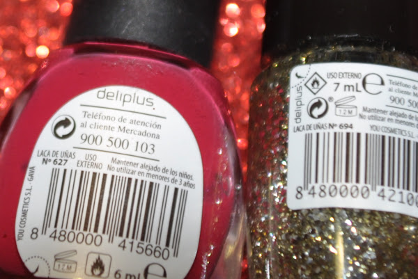 En mi caso los dos son de Deliplús,el rojo es el número 627 de una colección pasada pero os sirve cualquier rojo,eso sí,que no sea rojo sangre o vino.Por otra parte el esmalte de purpurina es de la nueva colección para navidad llamada "Sofía" y en concreto el número 694