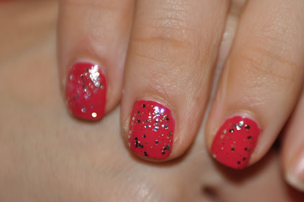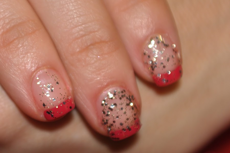 En la primera he creado una manicura francesa con el esmalte rojo,y una vez seco,he aplicado la purpurina por toda la uña: