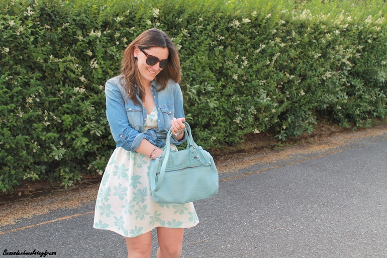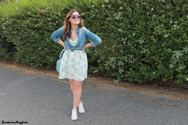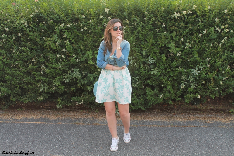 Vestido con estampado floral, escote pico y con vuelo, con camisa con nudo en la cintura, para un toque más sofisticado, converse y bolso a juego completan el look.
