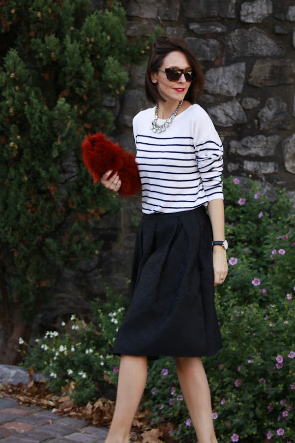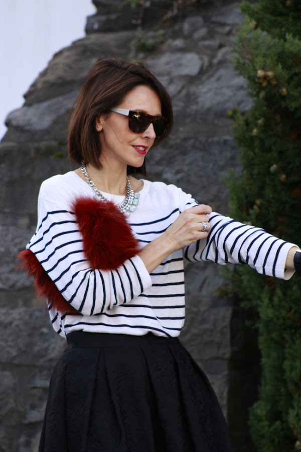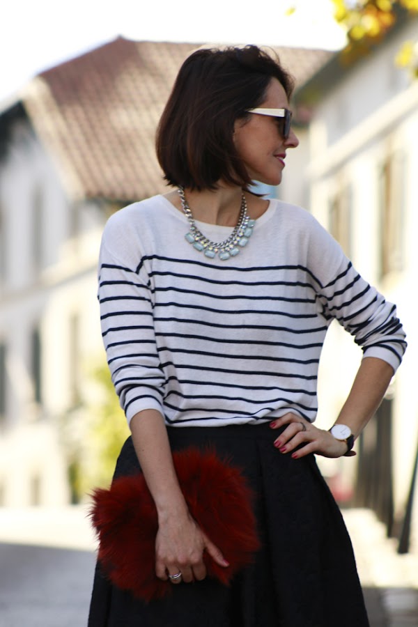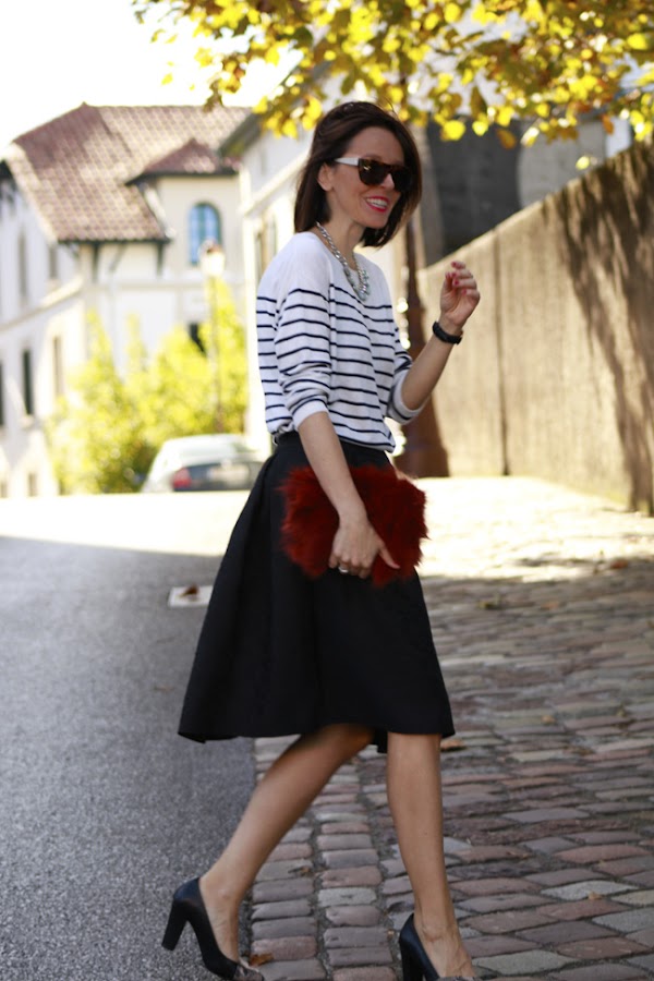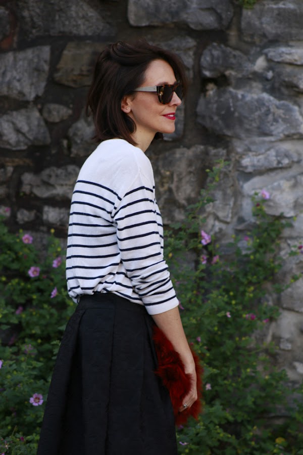 Zapato de tacón pero no tan fino y camiseta (de rayas en este caso), no perdemos la elegancia pero es un look mucho más fácil, válido para muchas más ocasiones.