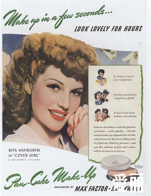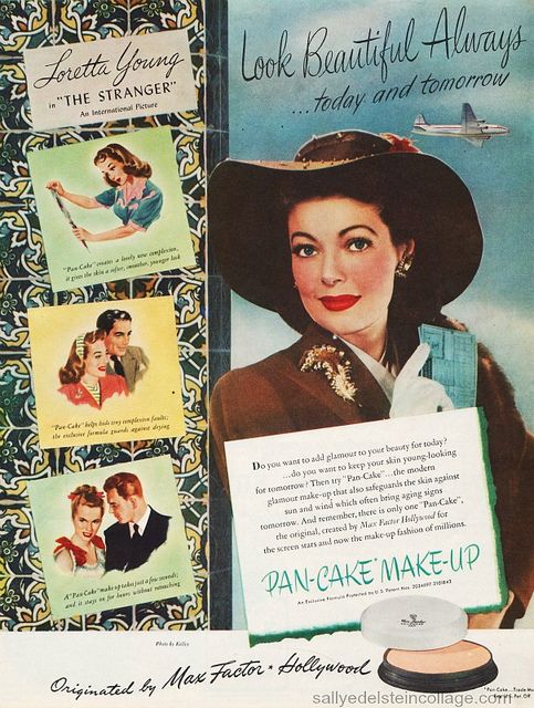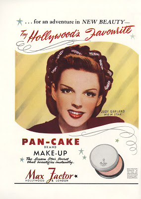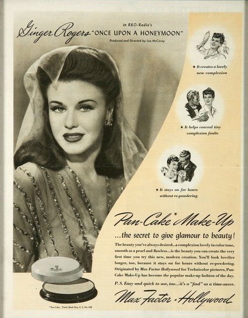 El famoso pan-cake makeup de Max-factor era el ultimo grito de la moda en esa decada.