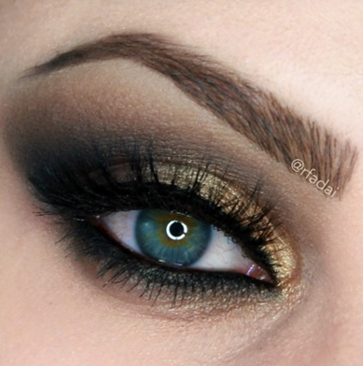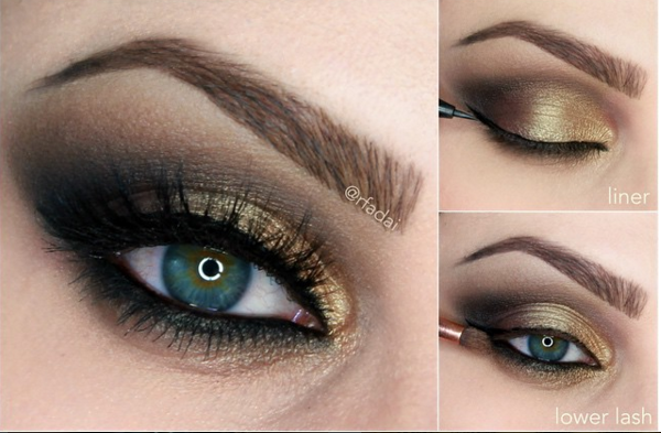 Iluminador o base de maquillaje, sombra color negro (mate), sombra dorada (puedes escoger con o sin glitter), delineador líquido color negro, delineador en lápiz negro, máscara para pestañas, pestañas postizas (opcional)