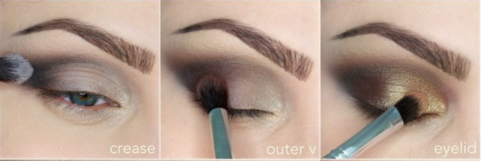 Toma un pincel chato y aplica un poco de sombra dorada en la mitad interna e inferior del ojo. Difuma bien. No olvides colocar un poco de esta sombra en el lagrimal pues le dará mucha más luminosidad al maquillaje.