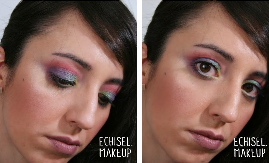 Como os he comentado en ocasiones me gusta investigar la forma de difuminar, unir y hacer transiciones entre colores y de esa idea y de unas sombras coloridas que quería probar salió este look.
