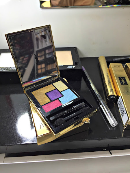 Todos los productos que usamos fueron de YSL. La base fue Touche Éclat Le Teint, el primer fondo de maquillaje antifatiga, que aporta una luminosidad increíble y borra los signos de cansancio junto a una cobertura perfecta. Como corrector, iluminador y para crear volúmenes, dos tonos del icónico Touche Éclat, que proporciona 8 horas de sueño con un sólo click gracias al Ruscus y la Vitamina E (y creedme que yo ese día las necesitaba). Después, polvos para matificar y el colorete Blush Volupté con un acabado aterciopelado muy luminoso. Aunque la estrella del look era esta paleta Couture Palette de la colección de Navidad que tiene unos tonos tan increíbles como estos: