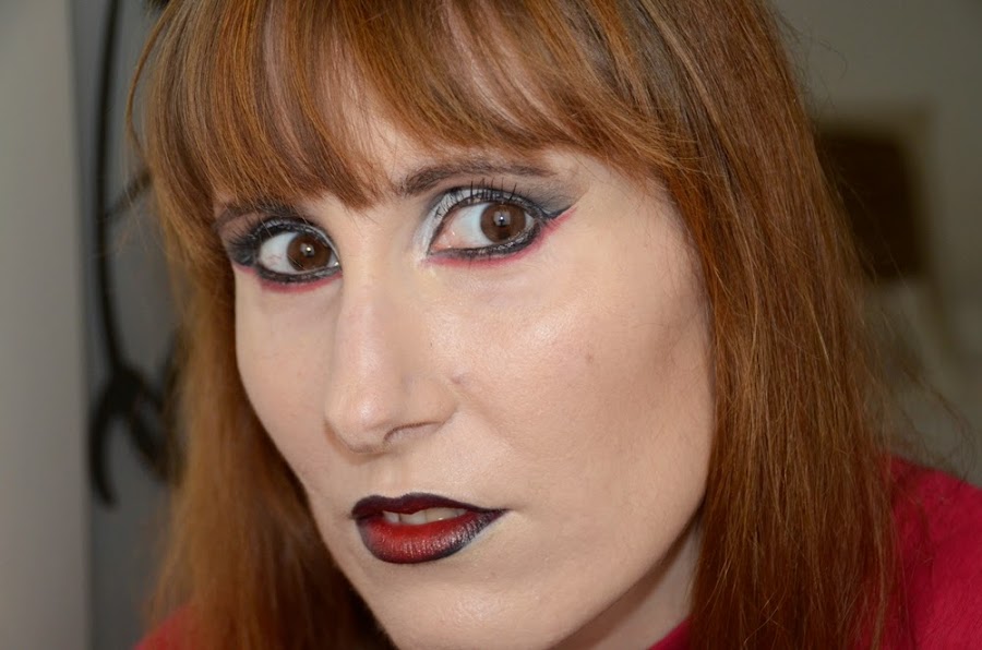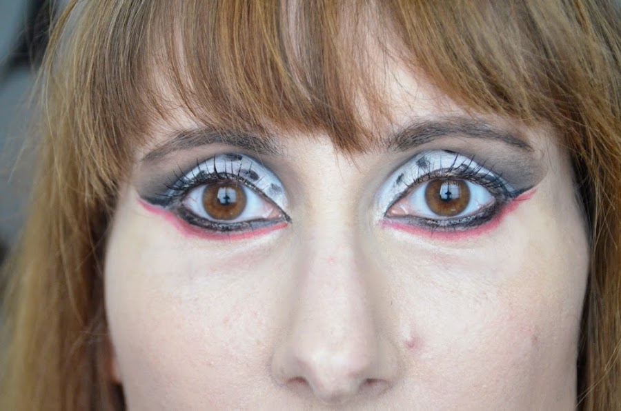 Primero aplicamos realizando una línea por la cuenca con sombra negra y vamos difuminando, nos ayudamos de un trozo de celo en el lateral para no pasarnos de la zona a maquillar. Aplicamos sombra al agua blanca por todo el párpado móvil y con una sombra negra también al agua vamos realizando las manchitas del vestido de Cruella de Vil, realizamos un delineado largo. Con un lápiz negro delineamos la línea del agua y a ras de las pestañas inferiores, bajo el negro realizaremos una línea con sombra roja. Aplicamos máscara de pestañas.