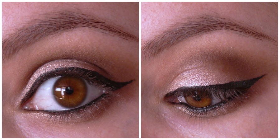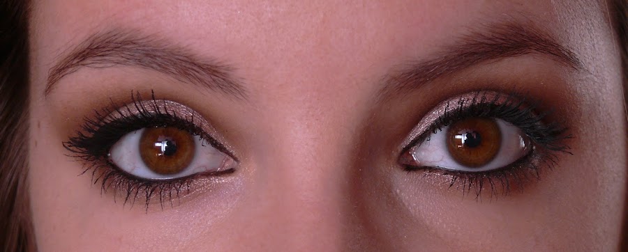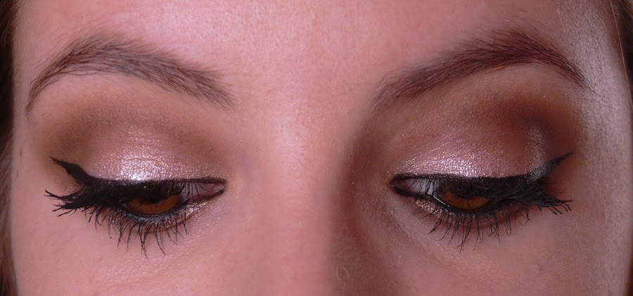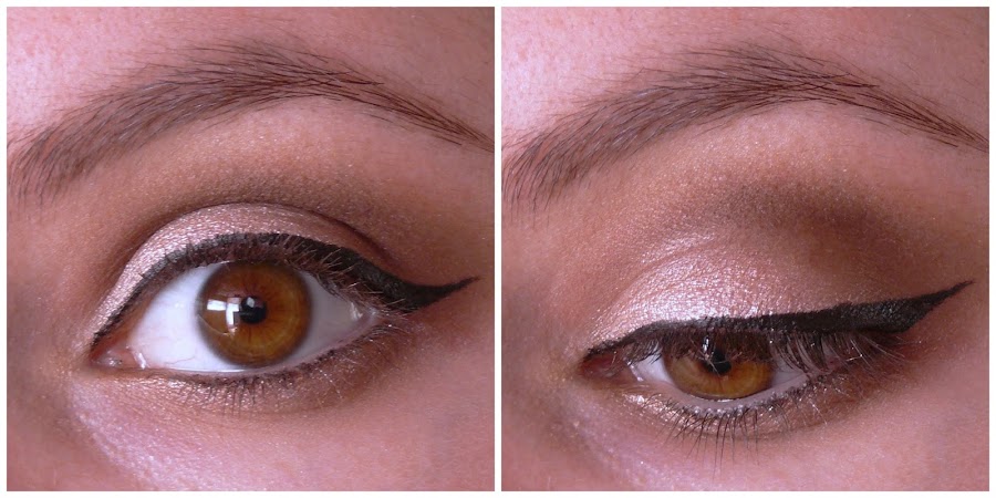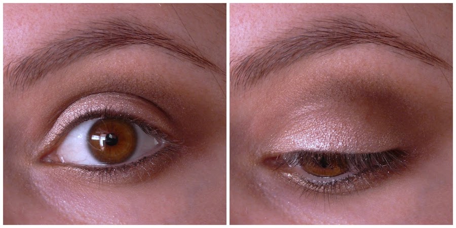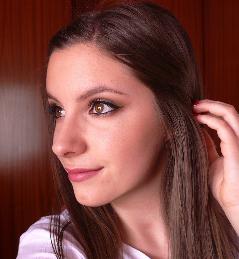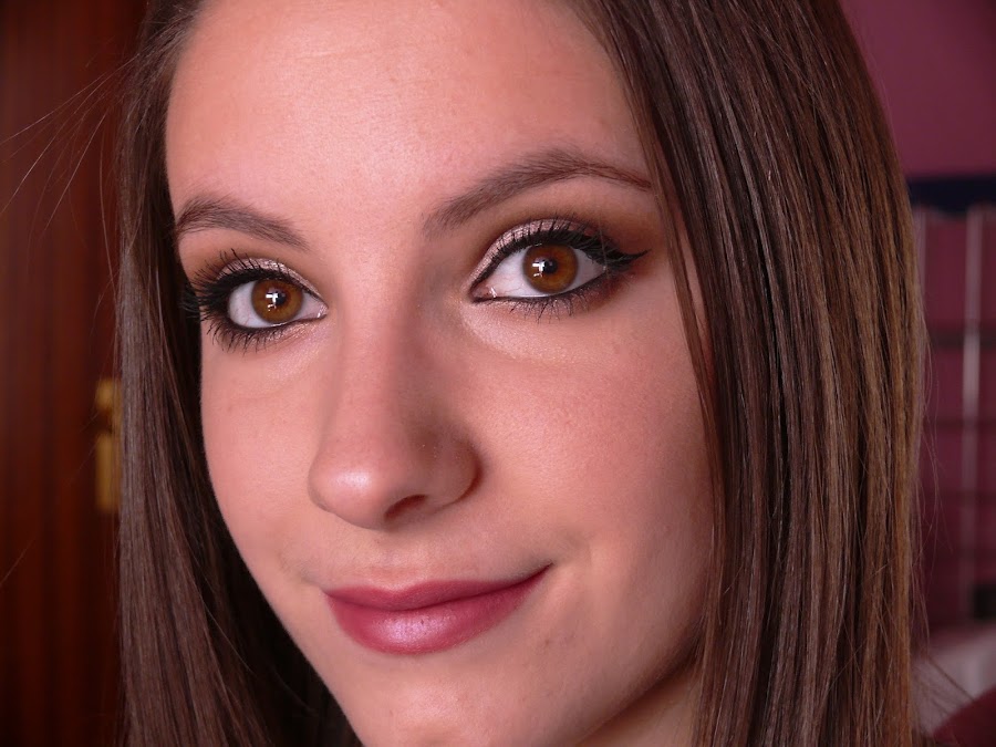 Es un maquillaje bastante rasgado y le da bastante protagonismo al ojo con el pigmento (o lo que sea que lleve) dorado, el delineado y las pestañas postizas. Lo he recreado pero adaptándolo a la forma de mis ojos, por lo que igual igual igual que en las fotos no va a salir jeje.