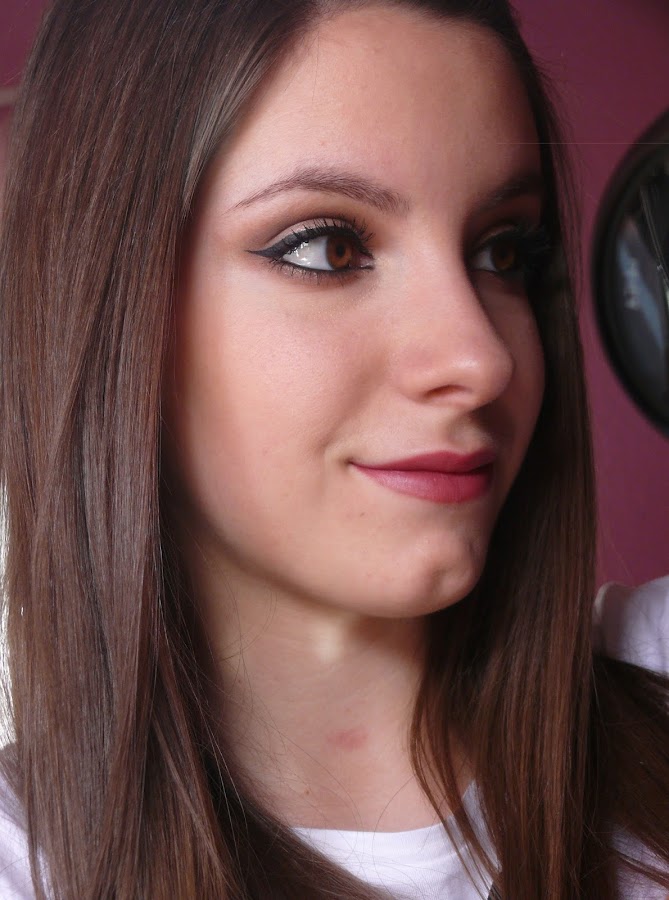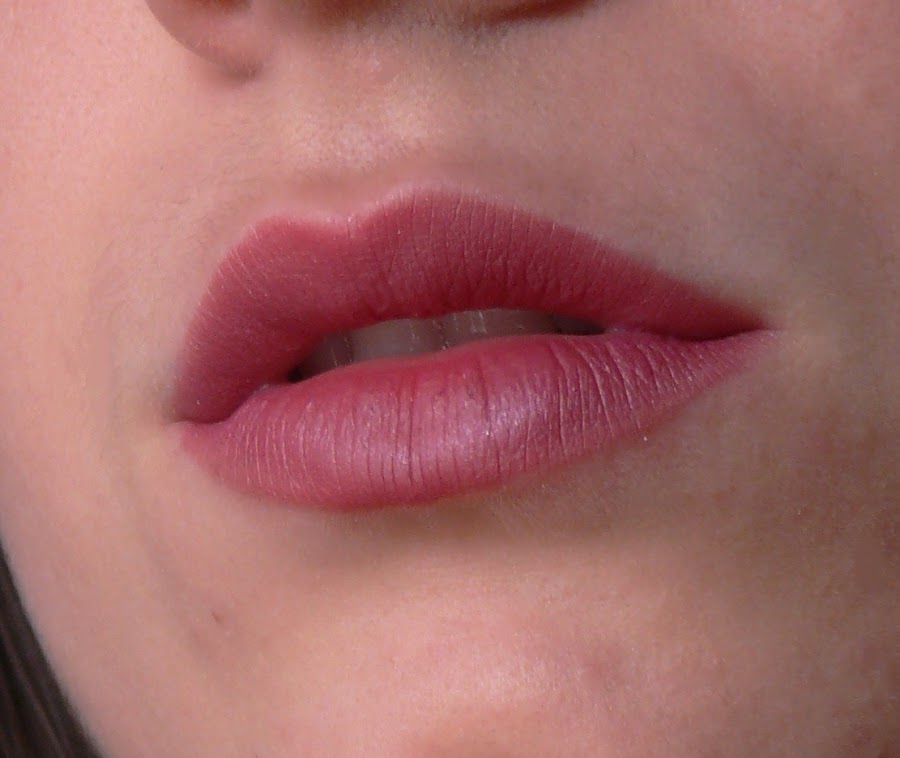 El color de sus labios es borgoña/marrón. Yo no tengo ningún labial igual, así que he hecho una mezcla de dos labiales, uno más marrón y otro moradillo y el resultado ha sido este.