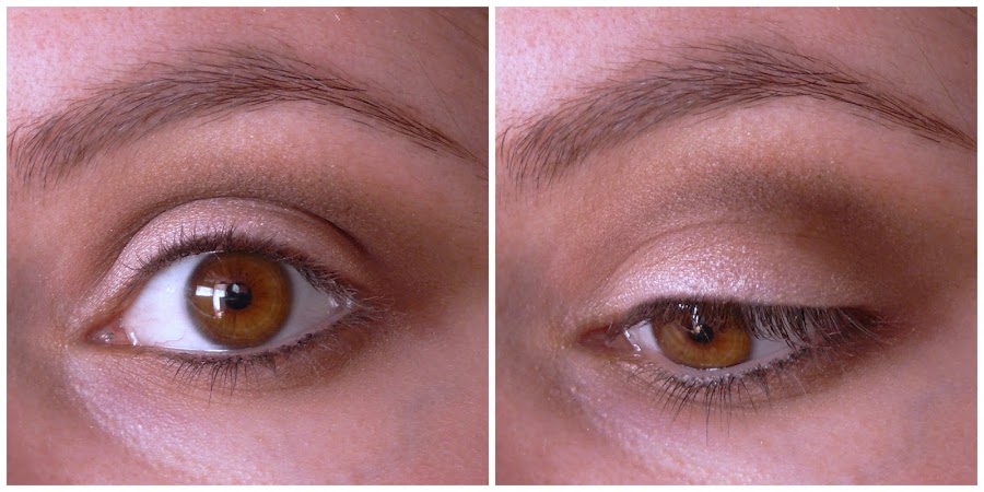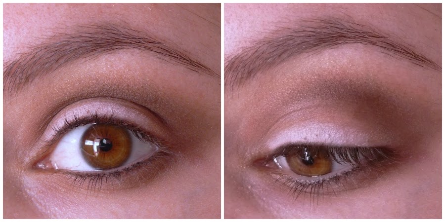 Lo primero que hago es iluminar el arco de la ceja con una sombrita clara, y crear la sombra de transición en la cuenca del ojo, difuminándola hasta casi llegar al arco de la ceja, mezclando una sombra camel y otra marrón (los productos utilizados estarán al final de la entrada).