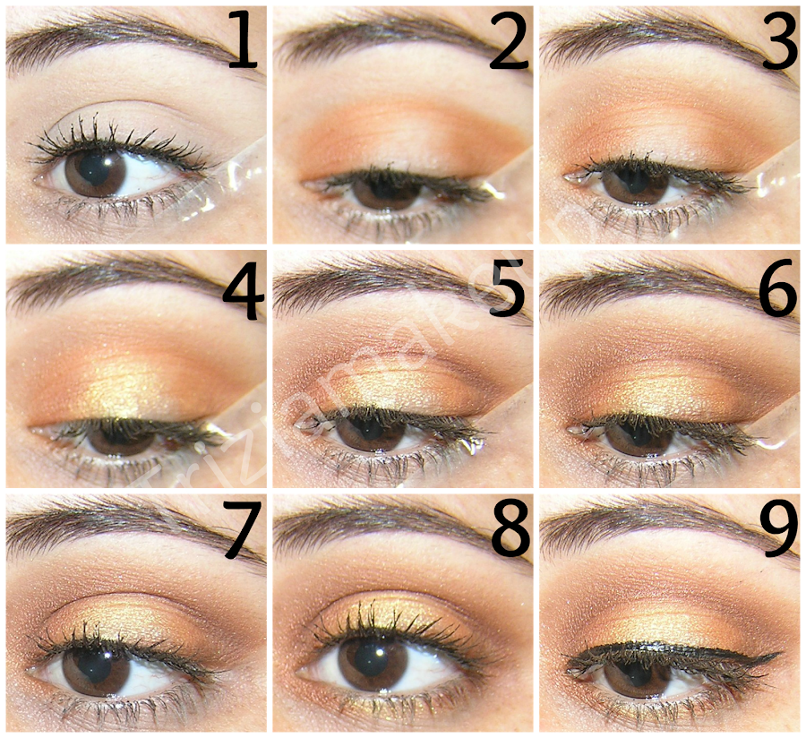 1. En primer lugar he aplicado un trozo de cinta adesiva, la prebase de párpados y una sombra beige mate también en todo el párpado para que luego nos sea más fácil difuminar las sombras.2. He aplicado el pigmento anaranjado en el párpado móvil, dejando la parte del centro totalmente libre.