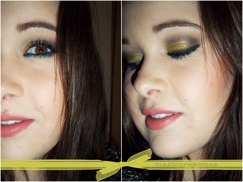 En este maquillaje he querido marcar más los ojos que en el look que os enseñaba hace unos días (aquí). He usado en todo el parpado móvil un dorado verdoso, para dar un poco más de profundidad al ojo puse un verde más oscuro haciendo forma de V. Lo difumine bien para que se integraran los dos colores y con una sombra negra a ras de las pestañas hice un pequeño delineado difuminado. Por último maquillé con un jumbo verde las pestañas inferiores. En esta ocasión, ya que los ojos estaban bastante marcados, me decidí por un labial nude.