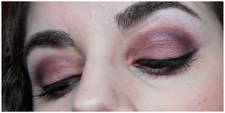 Como veis es un maquillaje muy fácil de realizar, usando dos sombras mates en todo el párpado móvil y oscureciendo la cuenca y el extremo del ojo con la sombra más morada que trae la paleta. Difuminamos todo bien para que se integren las sombras, delineado y ponemos máscara de pestañas. A ras de las pestañas inferiores tambien puse un poco de las mismas sombras, pero esto ya es a gusto de cada una.