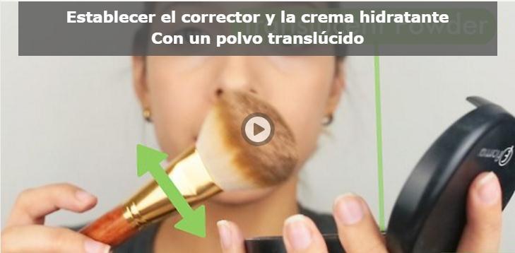5. Coloque el corrector y la crema hidratante con un polvo translúcido. Aplíquelo en su cara, idealmente usando un poco de polvo de terciopelo (a diferencia de un cepillo de polvo comun este no deja mucho polvo suelto) en un movimiento de presión y luego quite cualquier exceso. Si está usando un cepillo de polvo para aplicar, aplique el polvo a su cara antes de hacer los movimientos circulares.