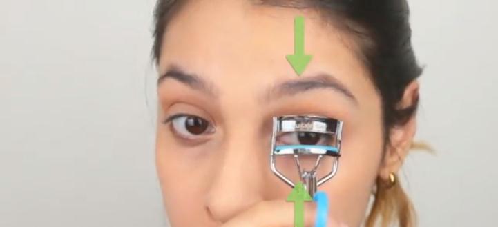 8. Coloque un rizador de pestañas en la base de las pestañas superiores (a lo largo las pestañas ) y presione durante cinco segundos.
