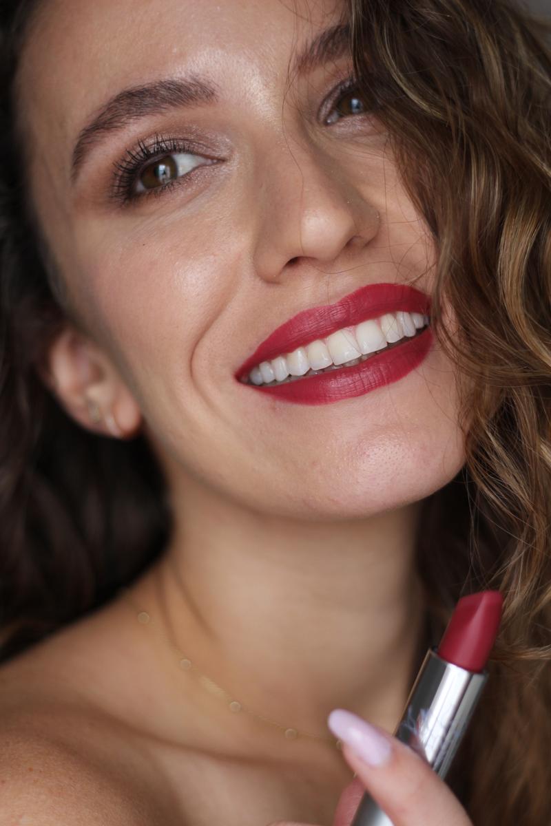 INTO THE BLOOM RADIANT MATTE LIPSTICK: el rojo que necesitas. El típico rojo que hace resaltar tus labios y el blanco de tus dientes de forma espectacular. Aún con mascarillas, necesitamos de estos rojos que nos hacen sentir divas. 60,2% Ingredientes de origen natural.