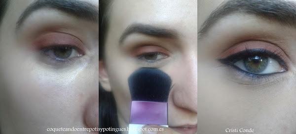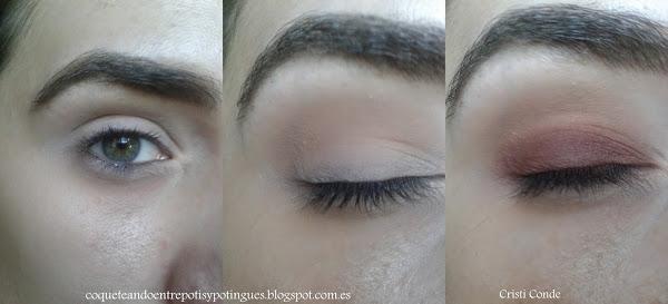 3º En el párpado móvil aplico la sombra que esta justo de bajo, es un tono marrón bronce son pequeños destellos. Una vez aplicada la sombra, difumino para que se mezclen las dos sombras.