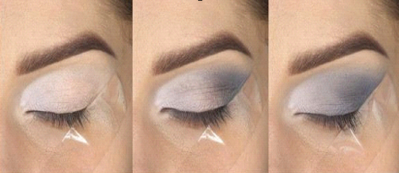 Coloca la cinta adhesiva desde el borde externo del ojo en dirección hacia la sien. Luego de aplicar pre base de maquillaje, aplica sombra blanco mate sobre la totalidad del párpado móvil. Difuma bien con ayuda de la brocha.