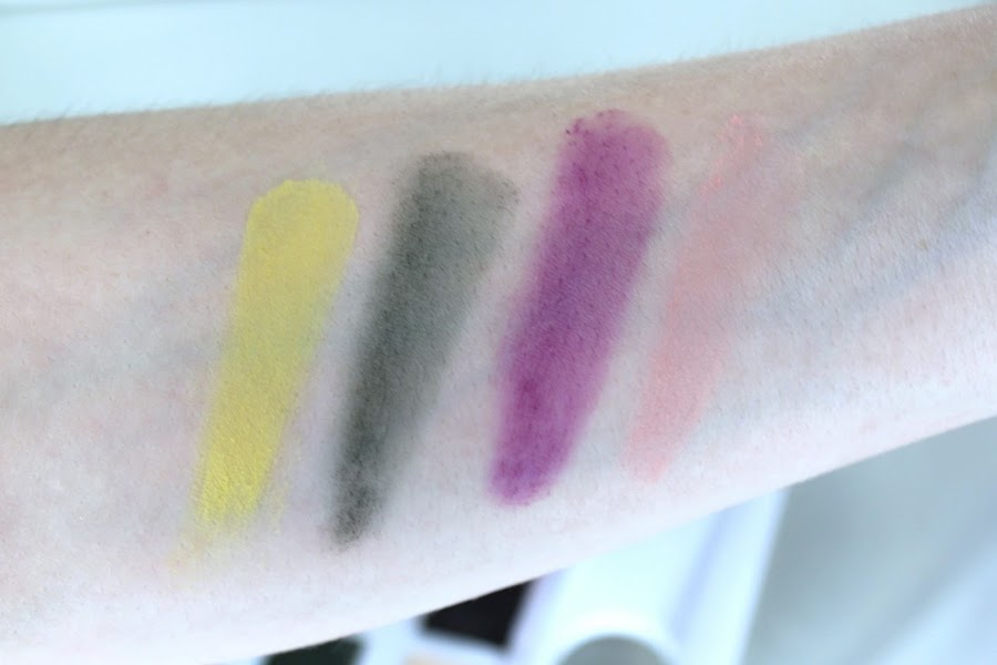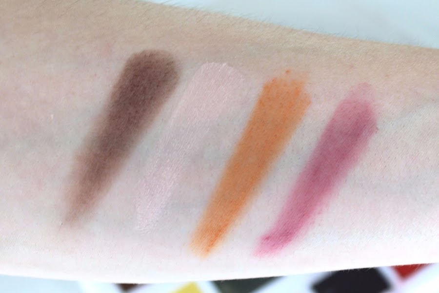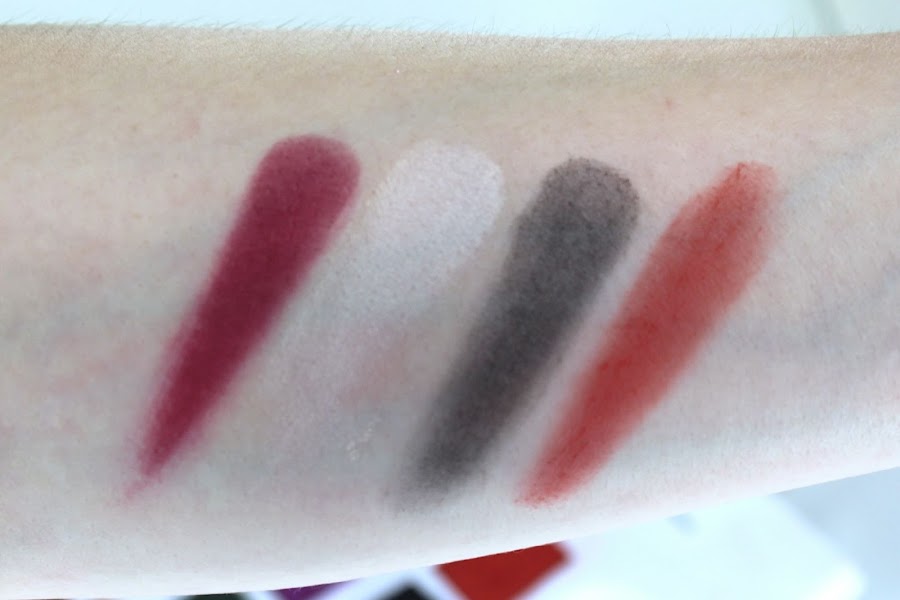 Y aquí os dejo con los swatches en el mismo orden en el que los tenéis en la foto anterior. La intensidad de algunas sombras se pierde bastante, entre ellas, por desgracia, la negra. Aunque a su favor tengo que decir que cuando se trabajan en el párpado no es tan evidente, y como siempre aplicamos más de una vez la podemos regular según la intensidad que queramos conseguir.