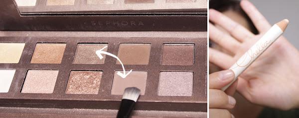 Empecé maquillando de mis ojos con los dos tonos de marrones que muestro en la foto. Son de la paleta It Nude de Sephora. El primero es un marrón clarito mate que apliqué en toda la cuenca, y el segundo es un tono más brillante que utilicé para darle un poco de profundidad a la mirada. Y para iluminar, utilicé mi lápiz de Chella en lagrimal y arco de las cejas.