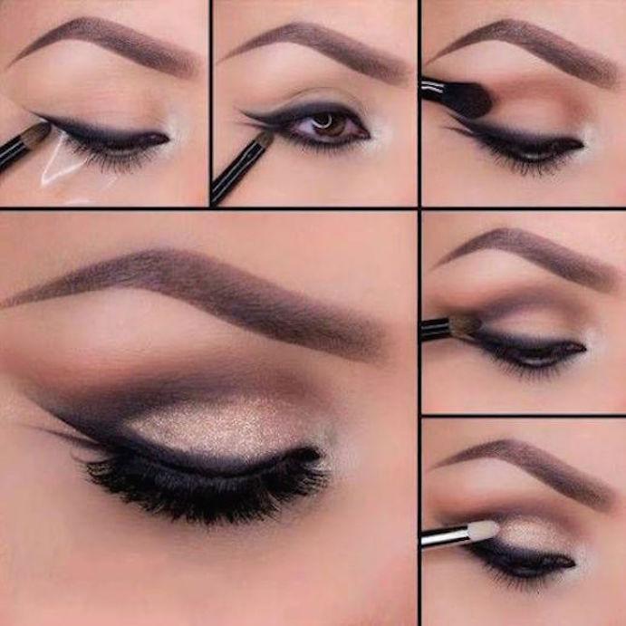 3. Base bronce mate sobre todo el párpado superior y color metálico en el párpado superior. Un toque original de este maquillaje es el uso de delineador de color e iluminador con brillo en el borde interior del ojo..