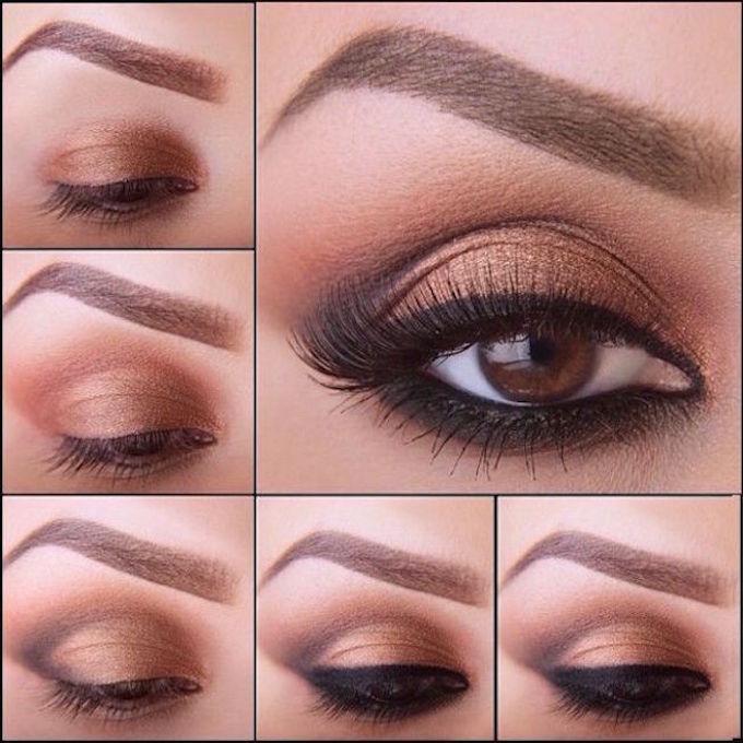 1. Sombra bronce en todo el ojo, sin smokey eyes. Brillo en el páspardo superior. Uso de pestañas postizas.