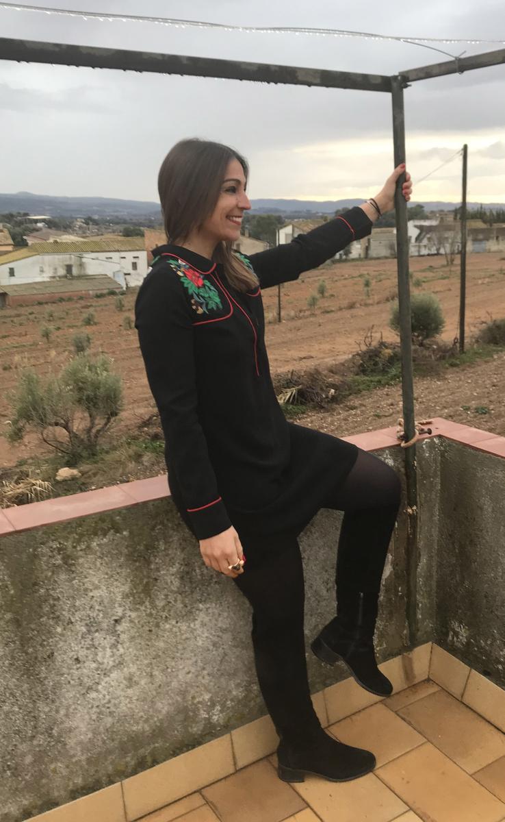 Un vestido camisero de la marca ROMWE, de corte recto en color negro y con unos bordados en la parte superior tanto por delante como por detrás.