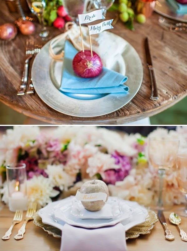 Using fruit, pineapples or corks as card holder, adapted to the theme of the wedding cards with different shapes, decorated with the letter of the food cards ... we can get an original result with that surprise our guests elements.