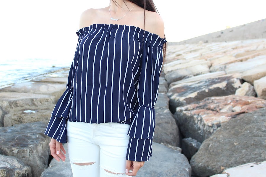 Estreno una preciosa blusa a rayas de hombros descubiertos y mangas acampanadas de SHEIN.
