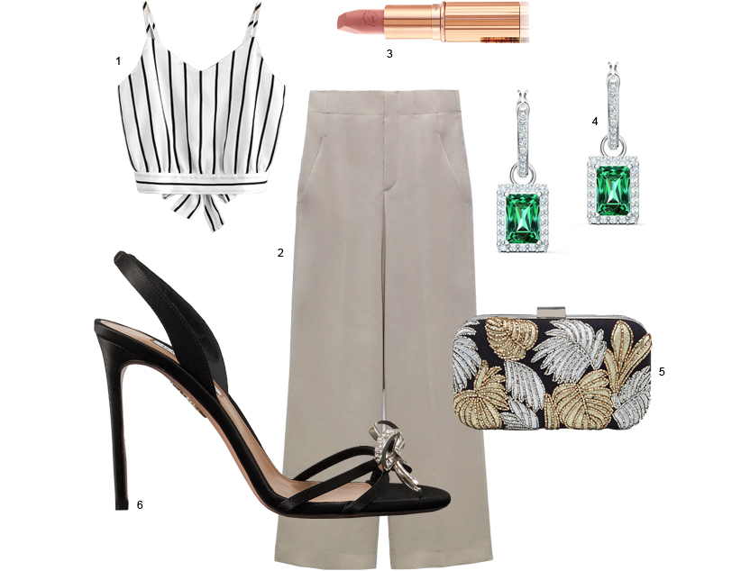 1. Top estampado rayas, Shein (05.00€) 2. Pantalón palazzo gris, Zara (49.95€) 3. Labial Hot lips tono Super Cindy, Charlotte Tilbury (32.00€) 4. Pendientes verdes, Swarovski (89.95€) 5. Clutch joya, Woman Fiesta El Corte Inglés (17.99€) 6. Sandalia detalle pedrería, Aquazzura (795.00€)