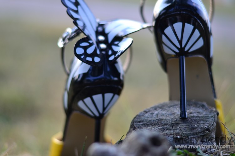 Con cierre de pulsera regulable que se ajusta al tobillo y detalle de alas de mariposa tornasoladas en azul cielo, estos salones inspirados en los míticos de Sophia Webster que tanto impactaron en su día por su estructura y diseño, gracias a estos llamativos adornos, tan rompedores, que hacen un guiño a la naturaleza, tampoco han pasado desapercibidos para mí.