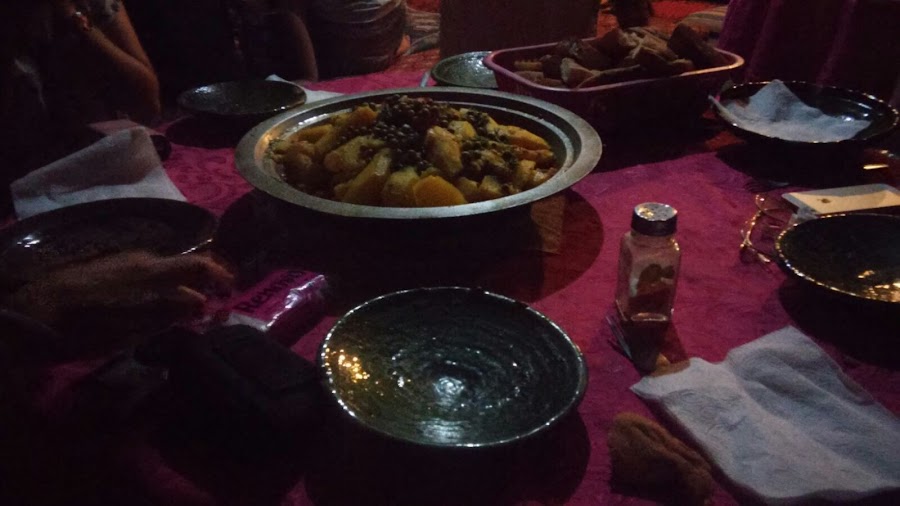 Llegamos a las haimas, nos instalamos y ya nos estaban esperando los bereberes para ofrecernos un vasito de té. Lo tomamos al aire libre y a continuación entramos en una haima para cenar sopa, tajín y fruta.