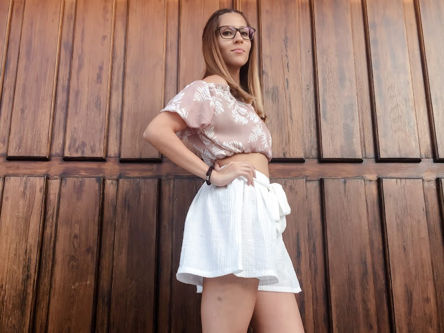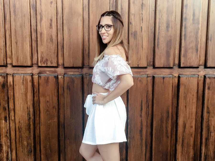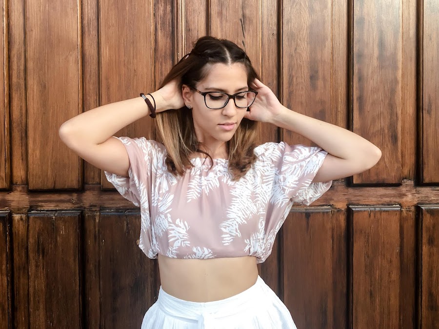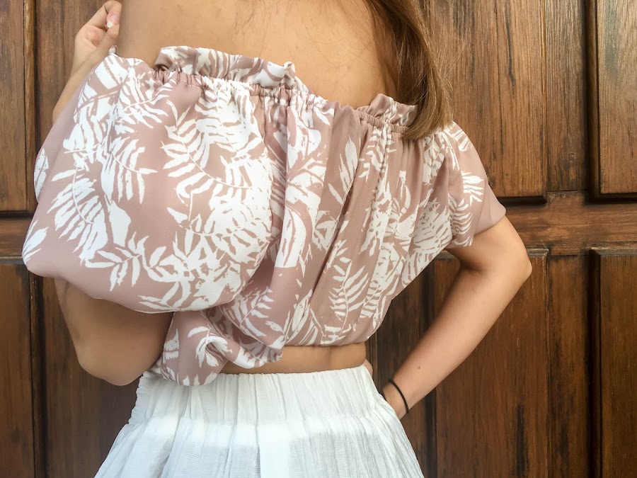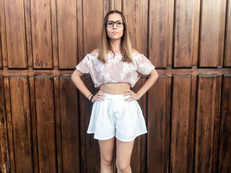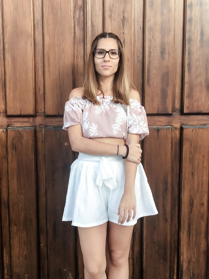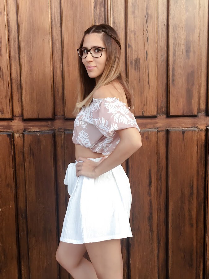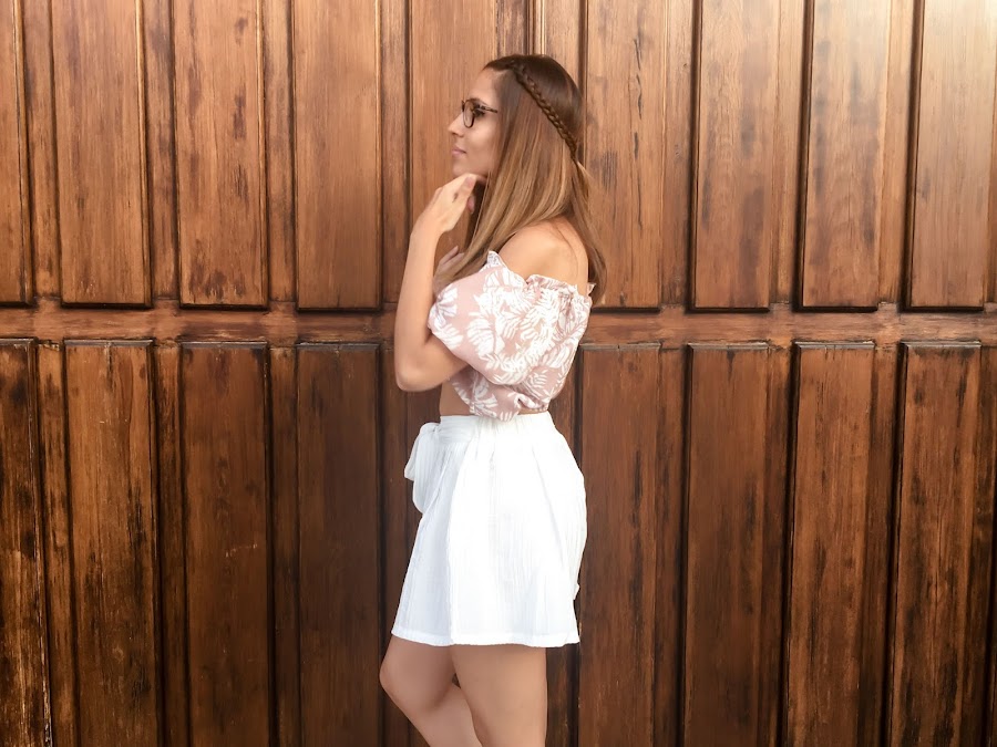 Para el look de hoy, he elegido un crop top en un tono marrón clarito con un estampado blanco, de hombros descubiertos y unos shorts blancos de vuelo súper cómodos.