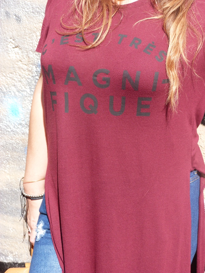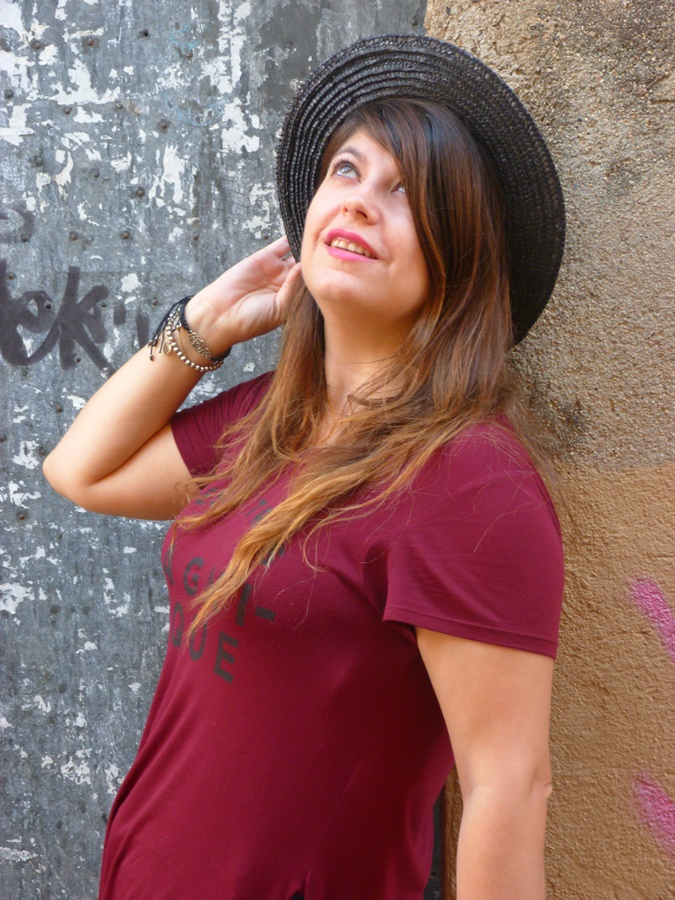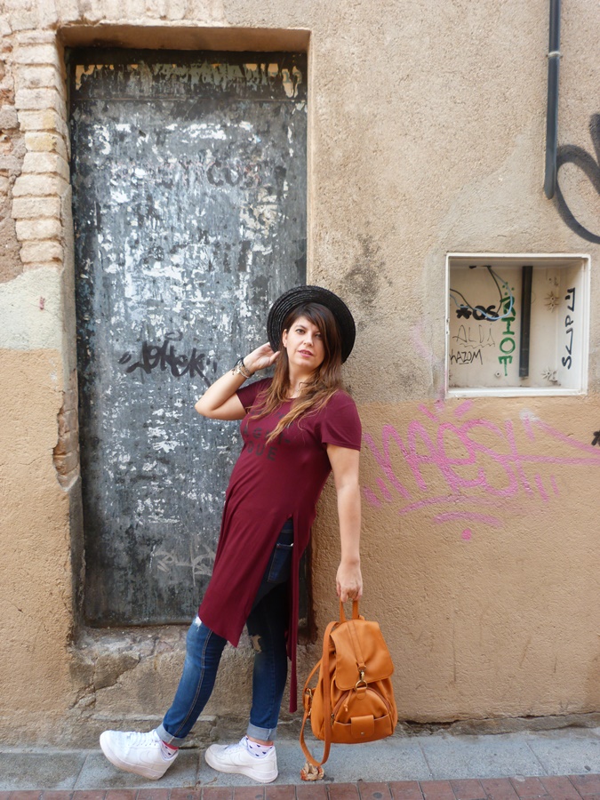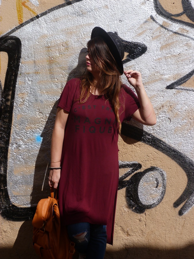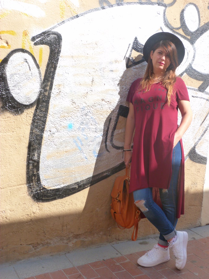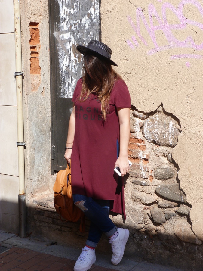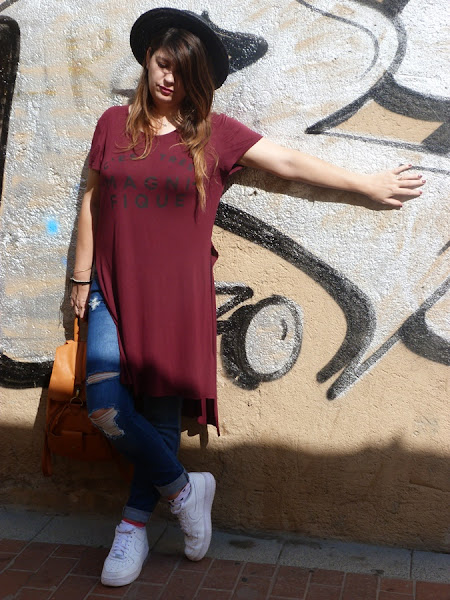 ¡¡¡Hi people!!!¿Como habéis pasado el día de hoy? yo he empezado a hacer algo de deporte y entre ayer que me empecé a practicar running y hoy que he practicado natación estoy súper cansada, pero contenta de haberme iniciado ;) nunca está de más hacer deporte y nunca es tarde, así que me he propuesto ser constante y complementarlo con una dieta sana, aunque ya llevo tiempo intentando comer sano e introduciendo nuevos alimentos a mi dieta. Ahora vayamos al tema de la moda que es de lo que mayoritariamente trata el blog, así que hoy os traigo un look con una de las prendas trendy de la temporada, aunque ya en verano empezó la tendencia de las camisetas largas o maxi, yo no había caído hasta que ví la camiseta que os muestro hoy en el color de la temporada para mí, el marsala, la encontré en Lefties y en ésta ocasión la he combinado con vaqueros rotos, zapatillas y sombrero, a ver que os parece el look de hoy ;)